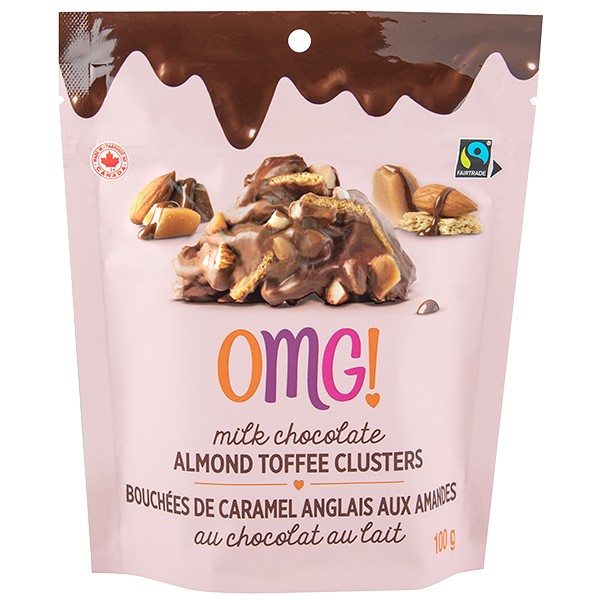 • Description: OMG! clusters are made with delicious Fairtrade chocolate, crispy graham wafers, dry roasted almonds, and toffee bits.