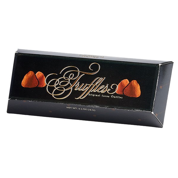 • Description: Two truffles per box. Made with the finest ingredients, each truffle is rolled in cocoa powder for a luscious finish, rich taste and intense flavour.