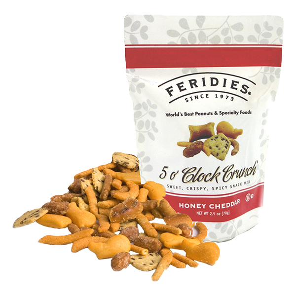 • Description: Feridies 5 O'clock Crunch® quickly disappears every time it is served. This popular honey cheddar mix includes honey roasted peanuts, cheddar cheese crackers, chili-lemon corn sticks, honey roasted sesame sticks, honey mustard pretzel sticks and salted corn chips with flax seed.